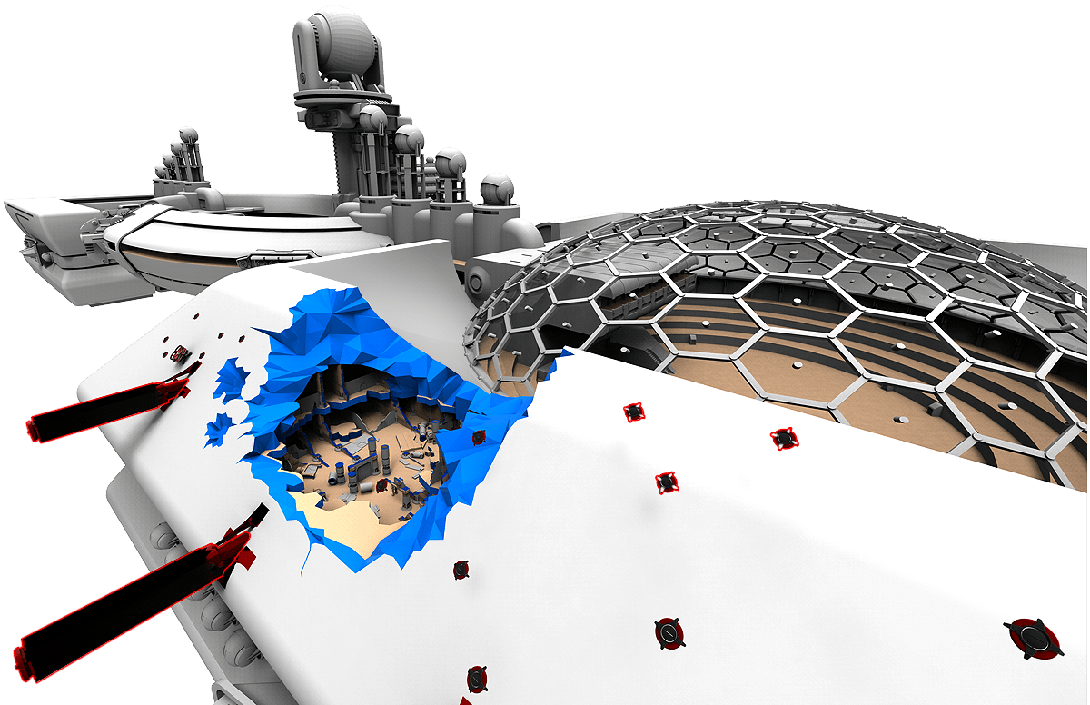 Most ships are protected by an energy barrier and armor. Different tactics of firing may cause the destruction of plating
